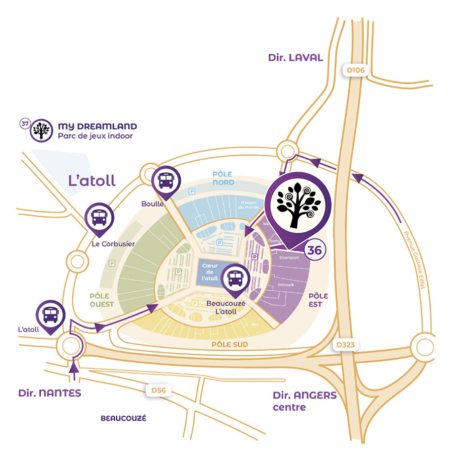 L’Atoll se situe le long de la D323 à Beaucouzé. Direction Segré – Rennes. Contournement nord de l’autoroute A 11, rocade Ouest (RD 106 – RD 775). Mydreamland vous attend de pied ferme pour passer un moment incroyable en famille. De nombreux parkings gratuits vous attendent dans le centre commercial.